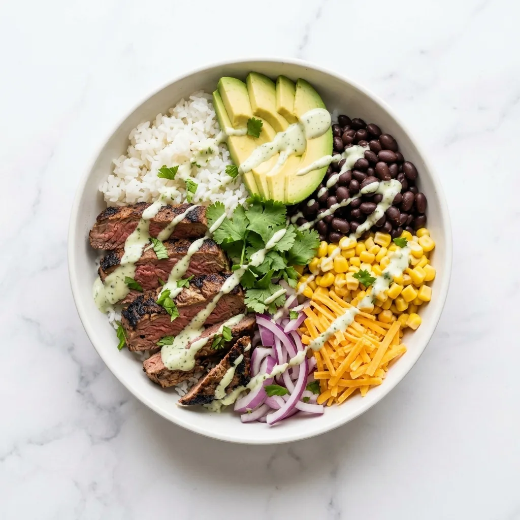 - Build bowls with rice, steak, avocado, black beans, corn, cheddar, and red onion.