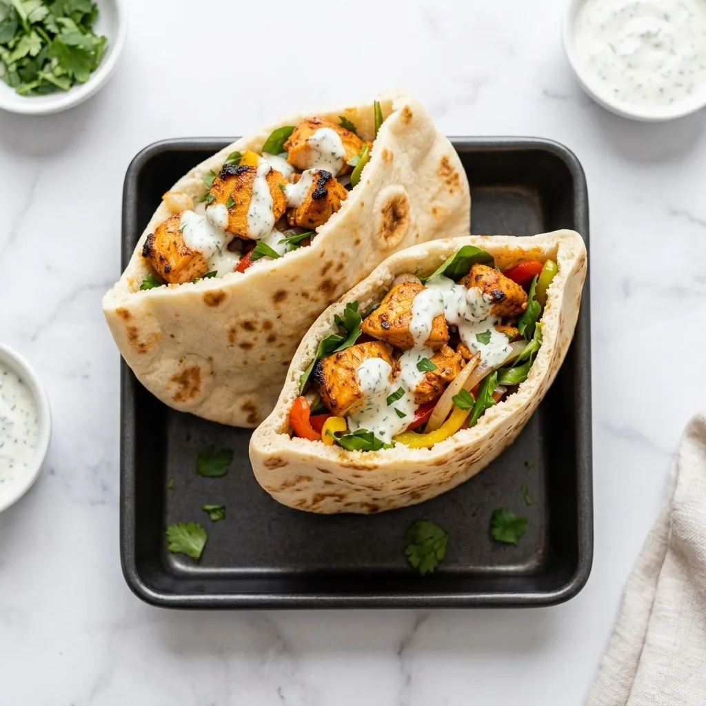 - Stuff the warm pitas with lettuce, fries, chicken, and tzatziki. Top with pickled onions, herbs, and feta.